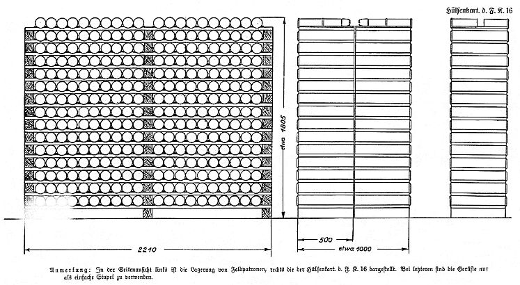 Stapelbild über Einlagern unge- korbter Patronen für Geschütze, Hülsenkart. d. F.K. 16 oder anderer Hülsenkart. von langer Form