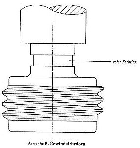 Bei Werkstücken mit 5 und weniger Gewindegängen und bei der 2 cm Munition und sämtlichen Geschossen mit Bodenzündern darf sich der Ausschuß-Gewindelehrdorn nicht mehr als höchstens 1 Gang einschrauben lassen. |