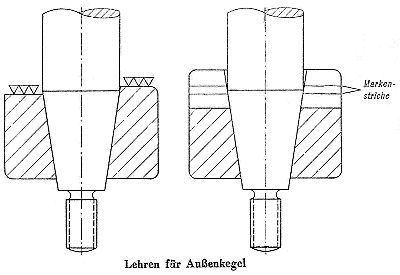 Lehren für Außenkegel sind in der Regel Lehrhülsen, die an einer Stirnfläche einen genau hergestellten Absatz haben. Dieser Absatz gibt die Grenzen an, wie weit sich das Werkstück einführen lassen muß. Zuweilen werden solche Lehrhülsen auch mit zwei Markenstrichen versehen (Bild 4 und 5).