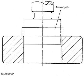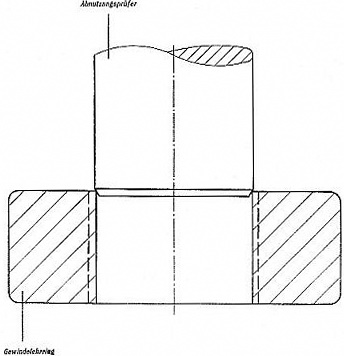 Für die Kriegsdauer wurde angeordnet, daß sich der Abnutzungsprüfer so weit in den Gewindelehrring einschrauben lassen darf, daß er auf der anderen Stelle des letzteren nicht hervorsteht. Bei Werkstücken, deren Gewindelänge gleich oder klei-ner ist als die des Lehrrings, darf jedoch der Abnutzungsprüfer nur höchstens bis zur halben Gewindelänge (des Werkstücks) sich einschrauben lassen. |