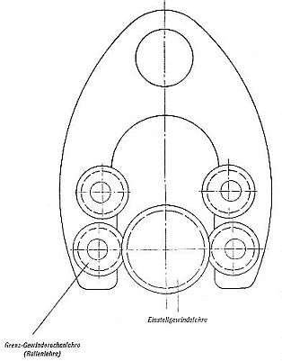 Sind Rollenlehren für die Bolzenprüfung vorgesehen (Nr. 14), so ist mit Hilfe von Ein-stellgewindelehren das vordere und hintere Rollenpaar einzustellen (Bild 29). Zu die-sem Zweck sind die Achsen der Rollen nicht konzentrisch, sondern exzentrisch gela-gert, so daß durch Verdrehen dieser Achsen mit Hilfe eines Schlüssels die Rollen ein-ander genähert bzw. entfernt werden können. |