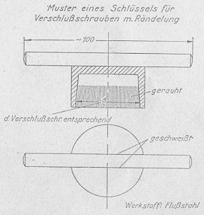 1) Für Verschlußschrauben aus Preßstoff, die zum Ein- und Aus-schrauben eine Rän-delung haben, ist kein Schlüssel vorgese-hen. Sie können aber mit einem im Betriebe zu fertigenden Schlüssel nach nebenstehen-der Skizze festgezogen werden. |