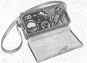 (3) Das Meßinstrument nebst Spannungsregler und Ausschalter ist auf einer Iso-lierstoffplatte montiert. Die Trockenbatterie, eine 1,5 Volt Stabelementzelle, ist von außen auswechselbar angeordnet. Zu diesem Zweck befindet sich auf der einen Kastenschmalseite eine mit Griff versehene runde Platte, die durch leichte Linksdrehung entfernt werden kann. In der dadurch frei werdenden Höhlung sitzt das Stabelement, welches herausgenommen und durch ein neues ersetzt werden kann. Der Prüfstecker ist an das Meßgerät fest angeschlossen und liegt im Kasten in einer geeignet gestalteten Haltevorrichtung. |