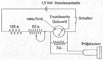 Parallel zum Meßinstrument liegt ein weiterer Widerstand und diesem parallel ist der Prüfstecker angeschlossen. |