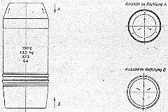 Sie tragen außerdem auf der vorderen und der Bodenfläche sowie auf der Mantel-fläche eingeschlagene Pfeile (Kennzeichen der blindgeladenen Geschosse). |
