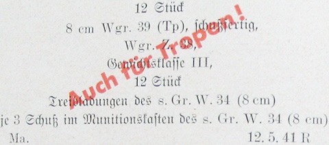 Die Schließfuge der Büchse (A) für Zusatzladungen des s.Gr.W. 34 (8 cm) ist durch Kle-beband luftdicht verschlossen. Der Inhaltszettel der Büchse mit den Teilkartuschen erhält den diagonallaufenden roten Aufdruck "Auch für Tropen !" |